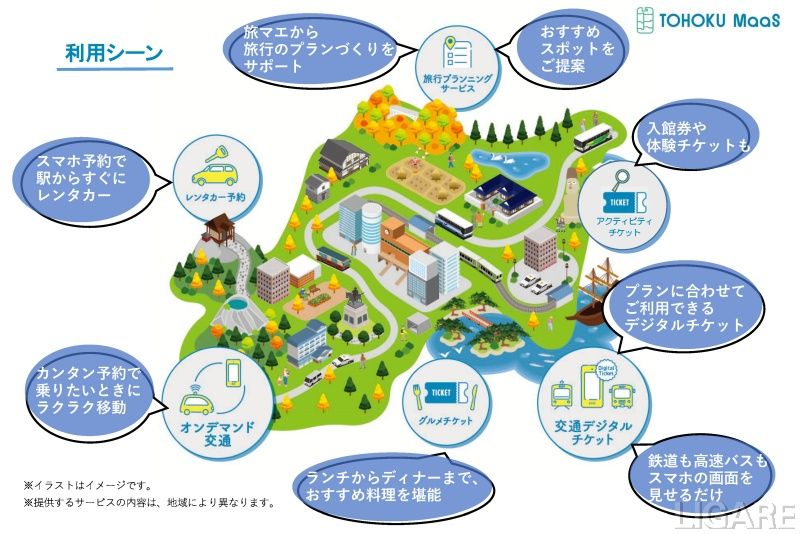 最近の大規模な取り組みは、JR東日本が東北デスティネーションキャンペーンに合わせて実施した「TOHOKU MaaS」が挙げられます。(2021/9/30終了)無料の会員登録をすると、東北6県を対象に、観光情報の検索や交通チケットの購入はもちろん、旅行プランの作成、マップの閲覧、観光施設やアクティビティのチケット購入、レンタサイクルやロッカー、さらにお土産の予約などを、1つのスマートフォンサイトで利用することができます。
